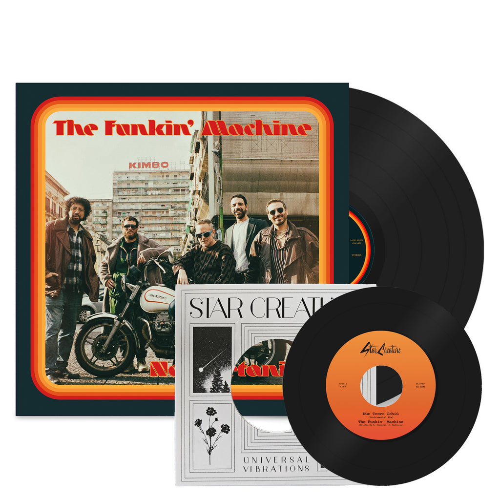 Massive album collaboration between Napoli's The Funkin' Machine and Chicago's Star Creature Records label, a very nice follow up to this past summer's Nun Trovo Cchiù 7". This heavyweight LP features full color jacket and art and features cuts spanning Cosmic Disco, to Jazz Funk, to Psychedelic Fusions of Afro Italo and Mediterranean Boogie - a future classic and crate staple amongst the highest ranks of contemporary world disco. Star Creature and it's hometown of Chicago have a long history with Italian dance music and producers including Giovani Damico, Modula and Leones and now continues with The Funkin' Machine an Italian Funk band from Naples, Italy with members from well known Italian Funk outfits like Nu Genea, Mystic Jungle and Parbleu. The band specializes in sparkling and groovy funky sounds from the slopes of Vesuvius.